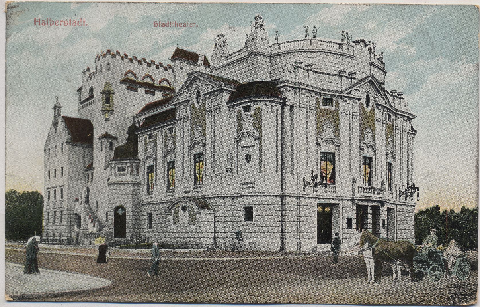 AK Halberstadt Stadttheater Menschen mit Pferdekutsche 1911
