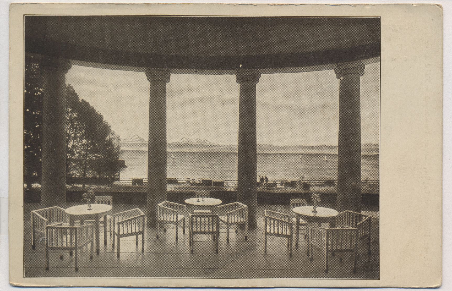VERKAUFT !!! AK Friedrichshafen Bodensee Kurgarten-Hotel Blick von der Terrasse auf den See und die Alpen 1920