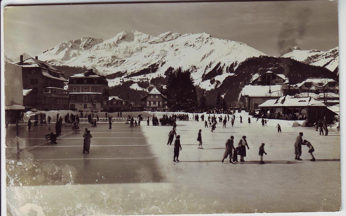 AK Foto Wengen Eisplatz mit Schwarzbirg viele Menschen BE Schweiz 1930